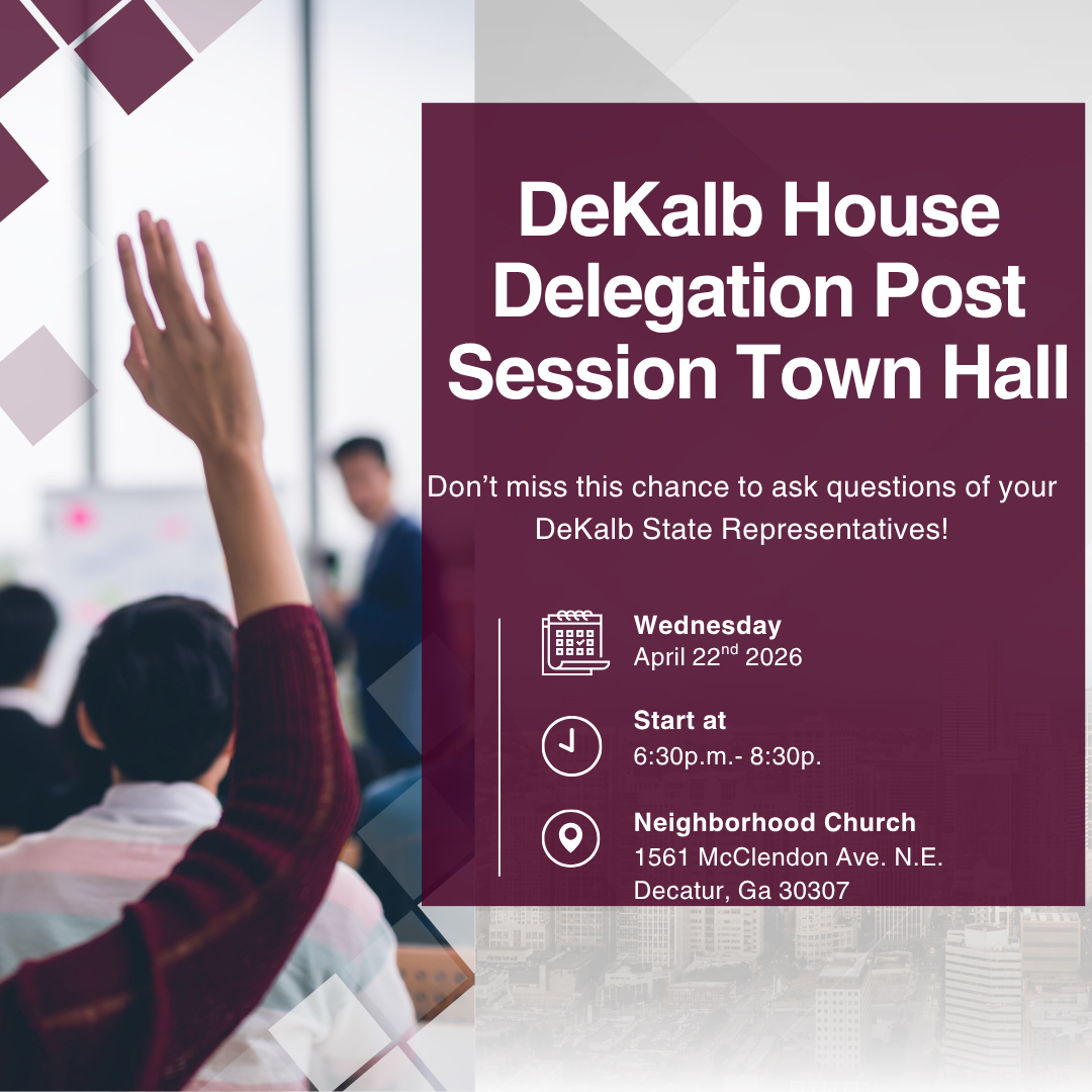 ATLANTA – DeKalb County House Legislative Delegation Chair Karla Drenner (D-Avondale Estates), Vice Chair Viola Davis (D-Stone Mountain) and Secretary Long Tran (D-Dunwoody), along with members of the DeKalb County House Legislative Delegation, will host a post-session town hall meeting on Wednesday, April 22, 2026, from 6:30 – 8:30 p.m. at the Neighborhood Church ATL in Decatur.