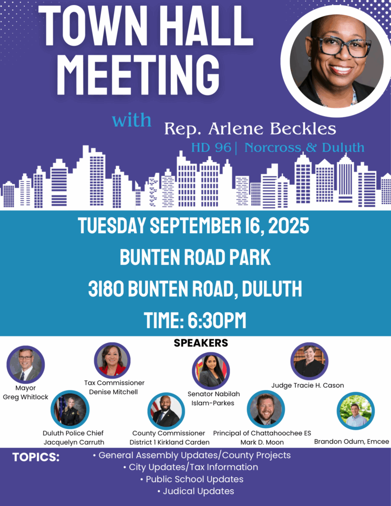 ATLANTA – State Representative Arlene Beckles (D-Norcross) will host a community town hall meeting on Tuesday, September 16, 2025, at 6:30 p.m. at Bunten Road Park in Duluth.