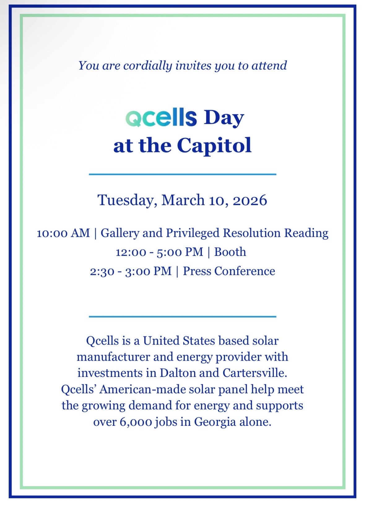 ATLANTA – State Representative Kasey Carpenter (R-Dalton), joined by other state legislators and Qcells, will host a press conference to highlight Qcells Day at the State Capitol on Tuesday, March 10, 2026, at 2:30 p.m. on the South Wing Steps of the Georgia State Capitol in Atlanta.