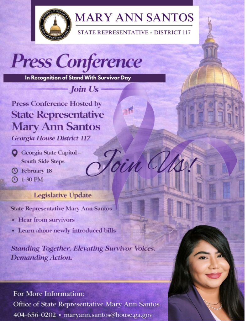 ATLANTA – State Representative Mary Ann Santos (D–McDonough) will hold a press conference in recognition of Stand with Survivors Day on Wednesday, February 18, 2026, at 1:30 p.m. at the South Wing Steps of the Georgia State Capitol.