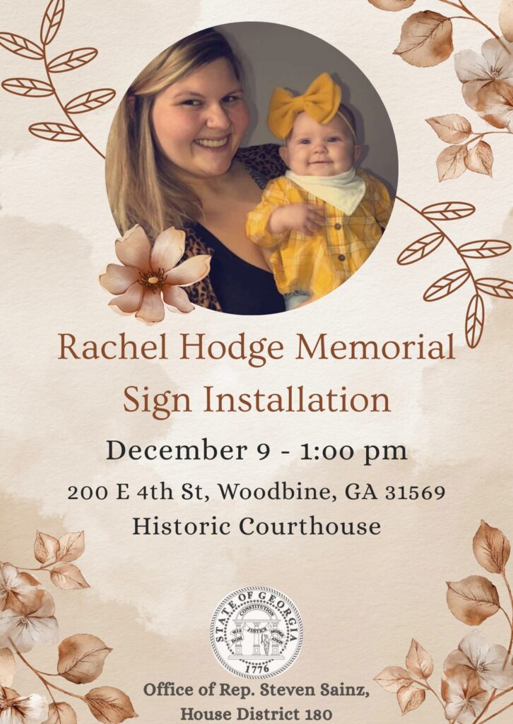 ATLANTA – State Representative Steven Sainz (R-St Marys), chairman of the House Interstate Cooperation Committee, will host a road naming ceremony to honor the Rachel Hodge Memorial Intersection TOMORROW, Tuesday, December 9, 2025, at 1 p.m. at the Camden County Historic Courthouse in Woodbine, Georgia.