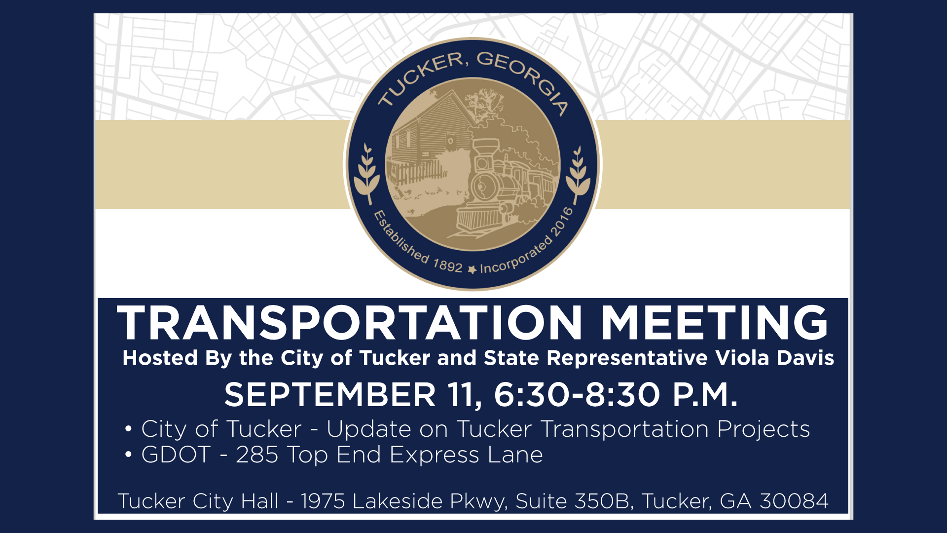 ATLANTA – State Representative Viola Davis (D-Stone Mountain), in partnership with the City of Tucker, will host a transportation town hall meeting on Thursday, September 11, 2025, from 6:30 – 8:30 p.m. at Tucker City Hall in Tucker, Georgia.