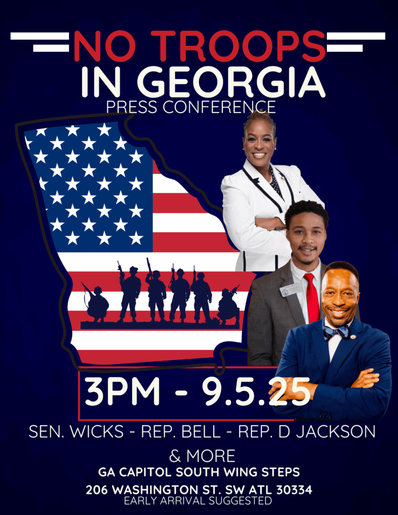 ATLANTA – State Representatives Eric Bell (D-Jonesboro) and Derrick Jackson (D-Tyrone), as well as State Senator Kenya Wicks (D-Fayette), will hold a press conference to express opposition to the deployment of the Georgia National Guard to support U.S. Immigration and Customs Enforcement (ICE) operations on Friday, September 5, 2025, at 3 p.m. at the South Wing Steps of the Georgia State Capitol.
