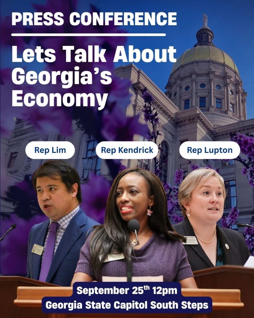 ATLANTA – State Representatives Marvin Lim (D-Norcross), Karen Lupton (D-Chamblee) and Dar’shun Kendrick (D-Lithonia) will hold a press conference to discuss Georgia’s economy on Thursday, September 25, 2025, at 12 p.m. at the South Wing Steps of the Georgia State Capitol in Atlanta.